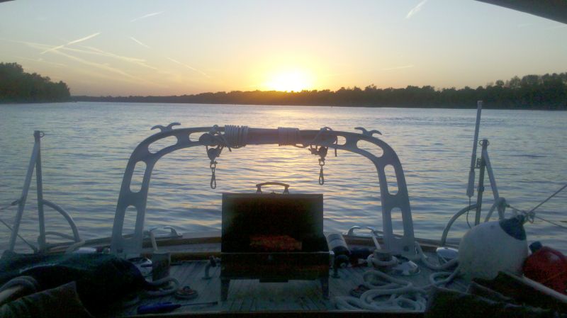 Grafton is a funky old place full of bars, produce stands, artisan outlets and B&B’s. No local provisions, however, so we did a Walmart-grocery run in the marina’s courtesy van to the metropolis of Jerseyville, IL. Huge thunder and lightning storms blew through while we were there, so it was good to be tied up.