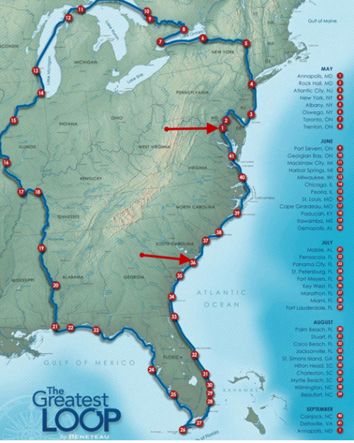 Here is a map of the Great Loop from the site of a Beneteau SwiftTrawler that is taking exactly the same route as Memsahib. Their site is www.thegreatestloop.com and is very interesting.